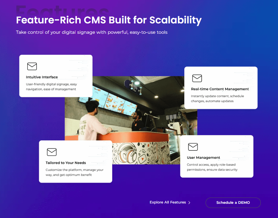 Built for flexibility and scalability for in-store digital signage solutions, it supports real-time updates, hardware compatibility, and data-driven insights to maximize impact.
